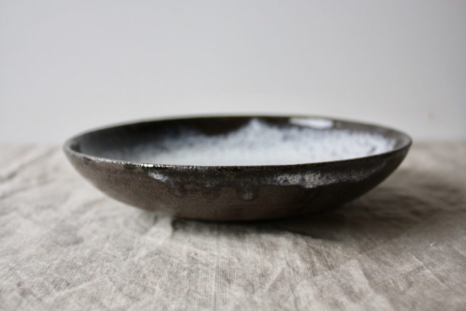 Elle est recouverte d’un émail au rendu blanc tacheté à l’intérieur et transparent brillant à l’extérieur, ponctué de blanc.