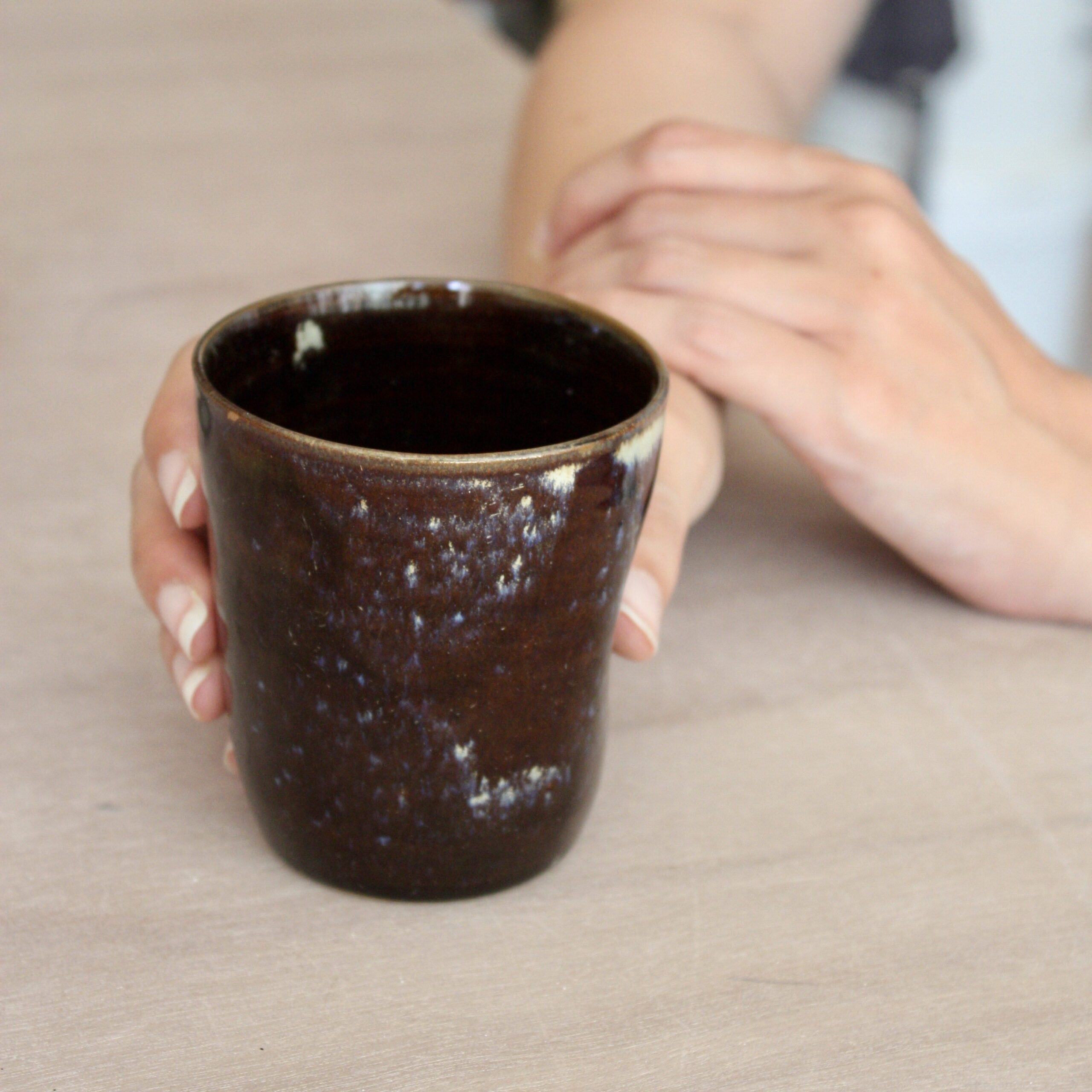 Fabrication : Chaque gobelet est entièrement réalisée à la main. Sur le tour de potier, la terre est guidée à l’aide de gestes minutieux. Une fois la terre raffermie, les ébauches tournées font l’objet de finitions. Les gobelets sont ensuite cuits une première fois à 980°C avant d’être émaillés. Une deuxième cuisson, cette fois à 1280°C fait fondre l’émail appliqué et leur donne leur allure finale.